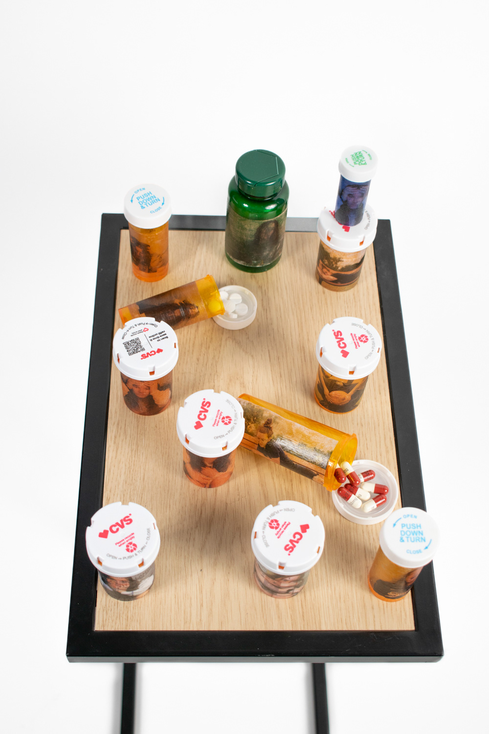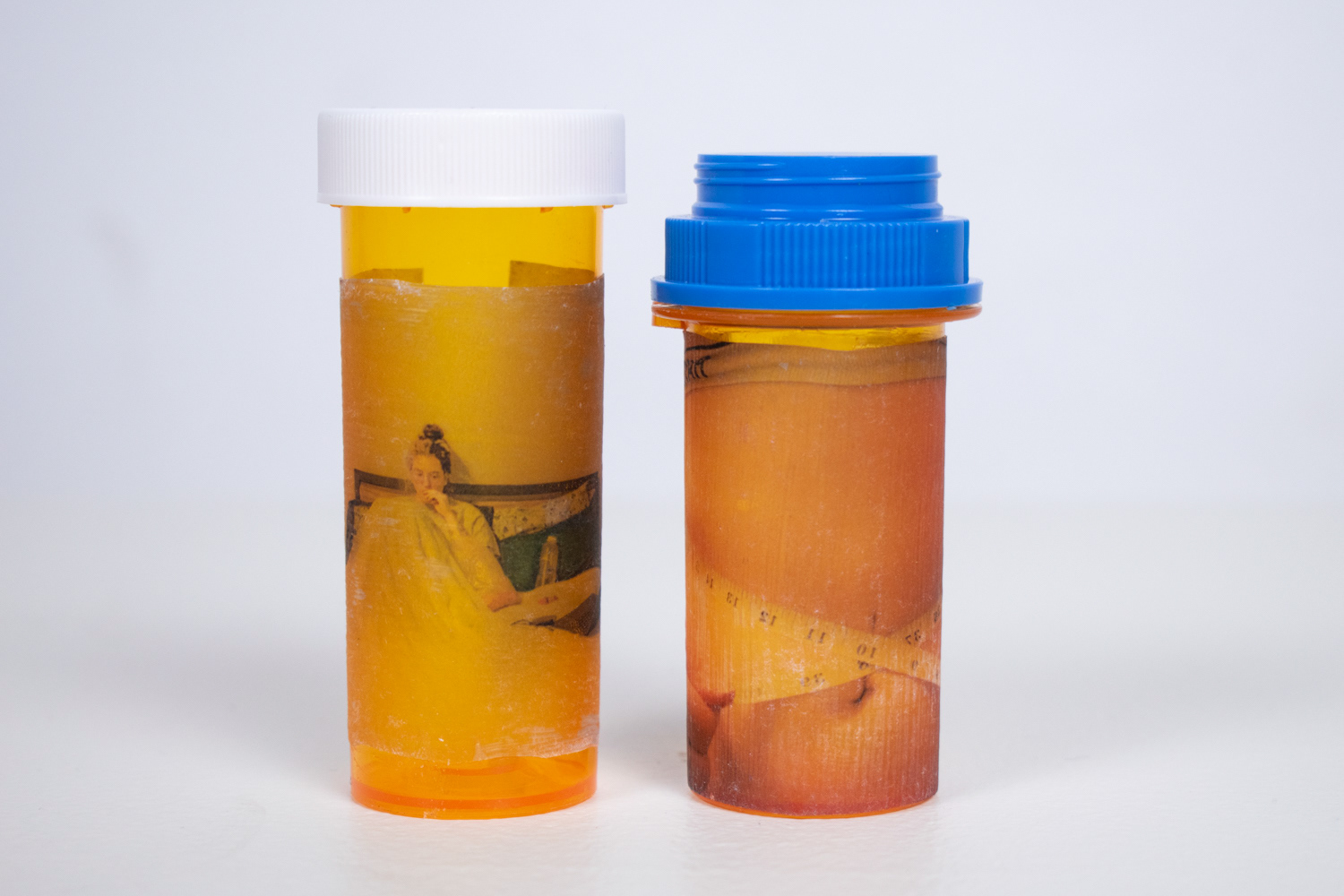 matte medium gel transfer on: chair, mirror, pill bottles and brick