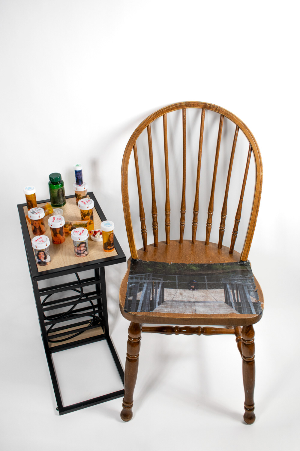 Shattered mind is an instillation piece that includes parts of my daily life and struggle with depression. I transferred images to multiple different objects because of their relation to mental health. The process of transfers takes a while, you have to build up the gel before you can rip off the paper and you still need to be gentle because it is such a fragile process, and this reminded me how with depression with the build up of everything and you can hide it until a certain point and it just breaks through. I chose to transfer images to bricks because of the heavy weight and burden depression plays in our lives. I used a wooden chair because they are uncomfortable, I wanted it to feel isolated and no one would want to sit down. I also transferred images to pill bottles to represent how many pills we can take but still not feel better and how they can make us feel worse in some cases.