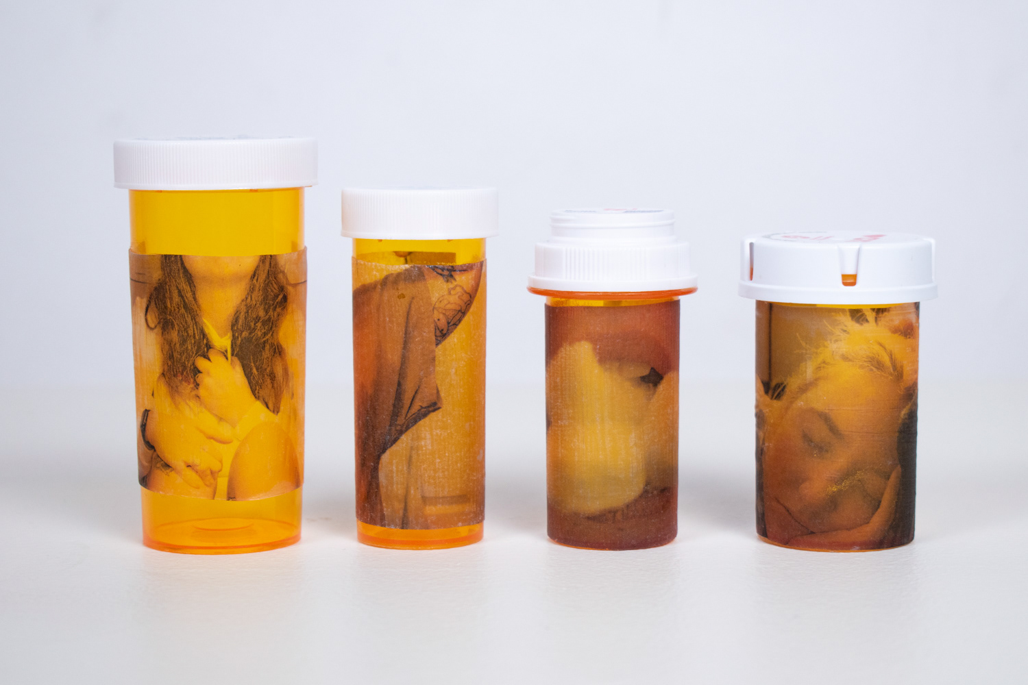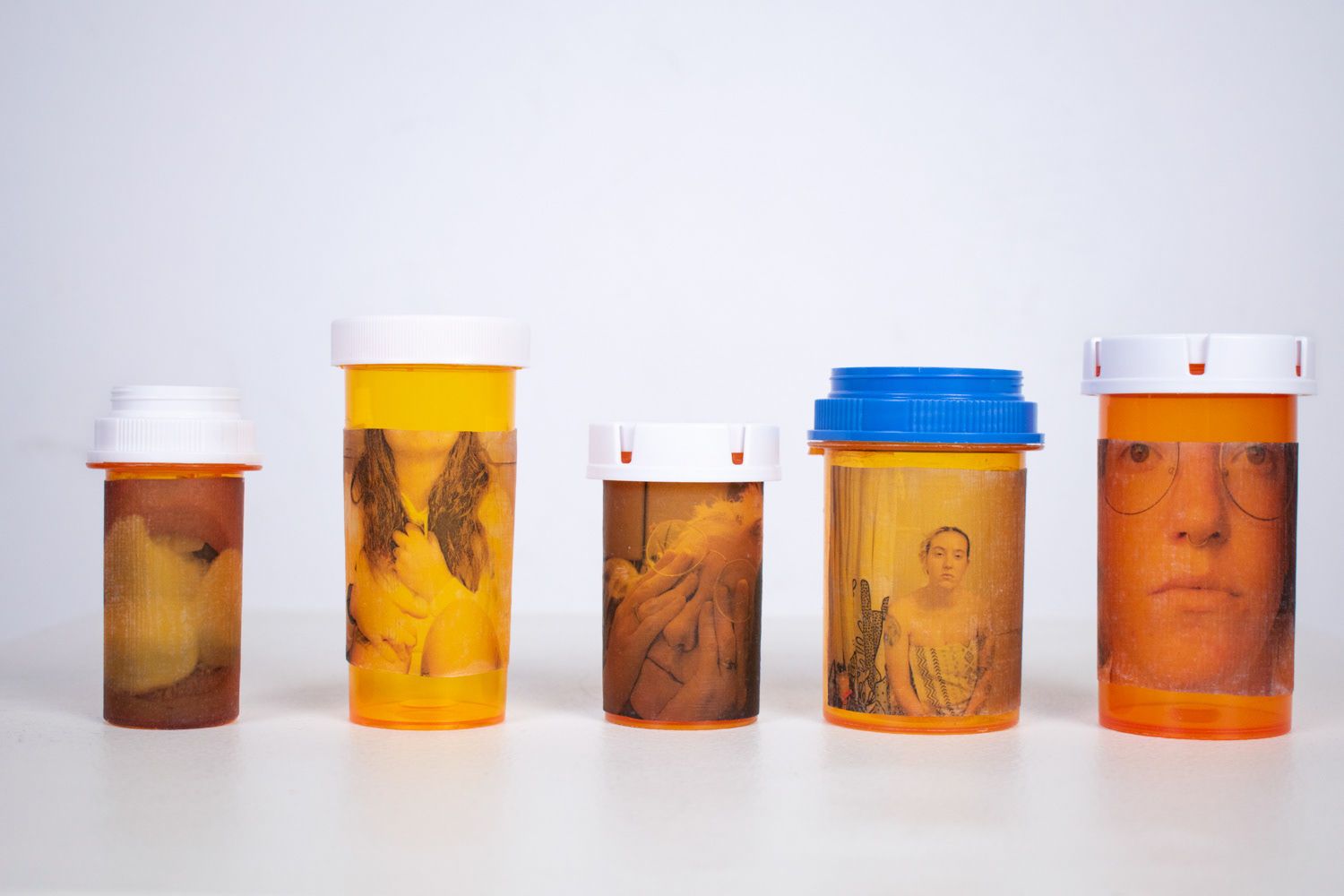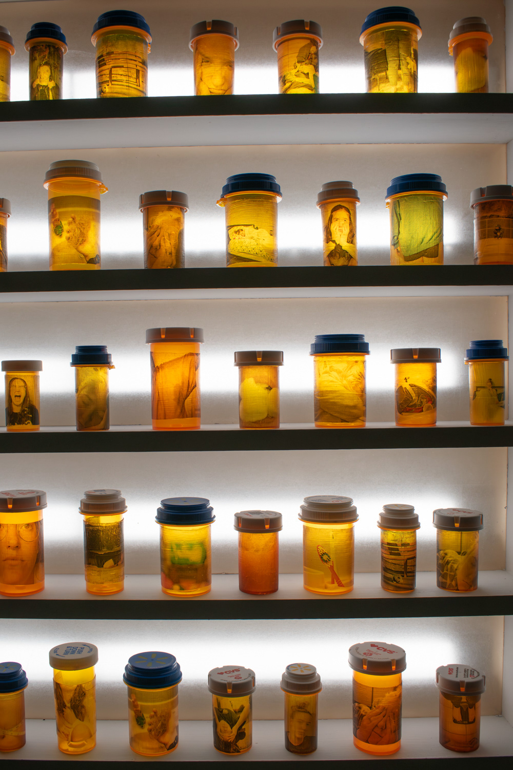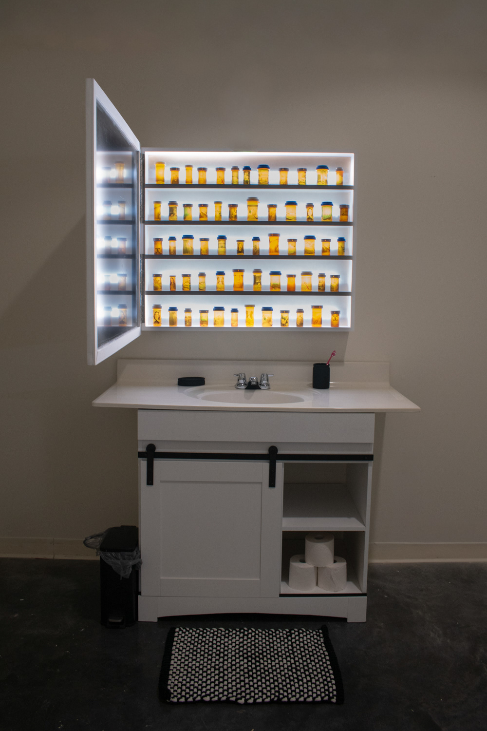 As a way to explore and question my own experience with bipolar disorder and depression, I created a medicine cabinet with sixty pill bottles. The oversized medicine cabinet represents the overwhelming effect that mental health can have on people’s lives. This number of bottles represents the number of months that I have been on medication. On the surface of the pill bottles, I illustrate different side effects of the medication, what symptoms individuals experienced before going on medication, and my own personal experience with taking psychotropic medications.