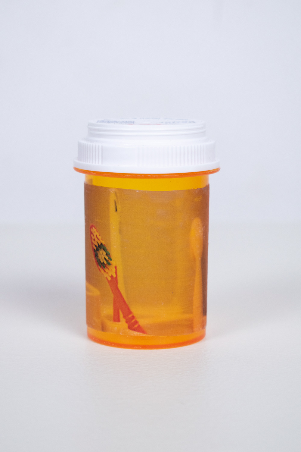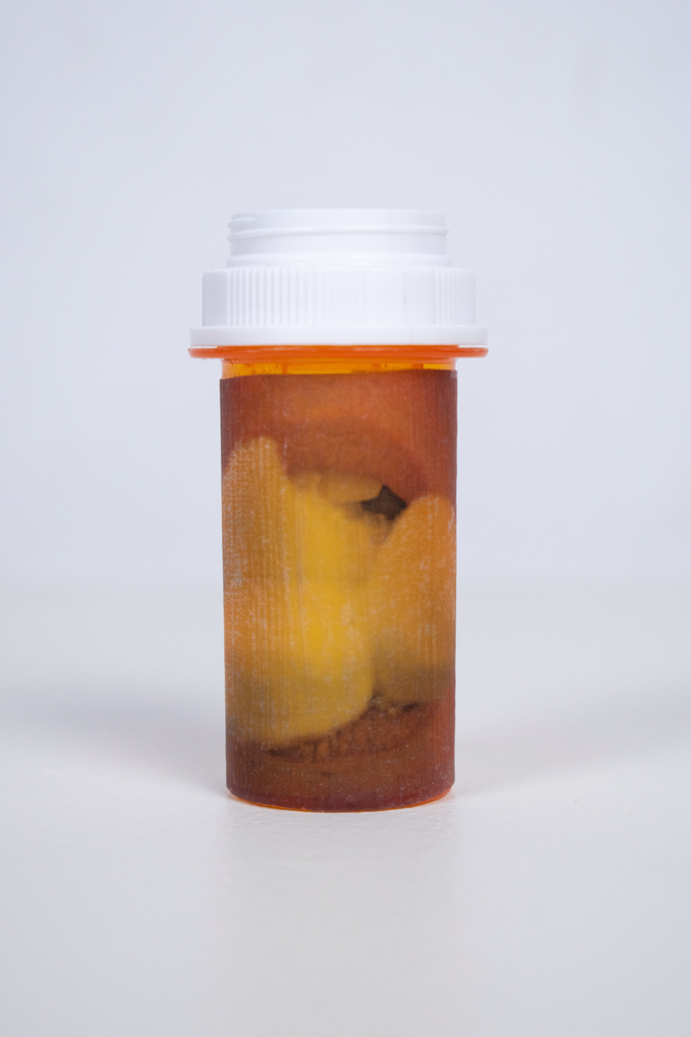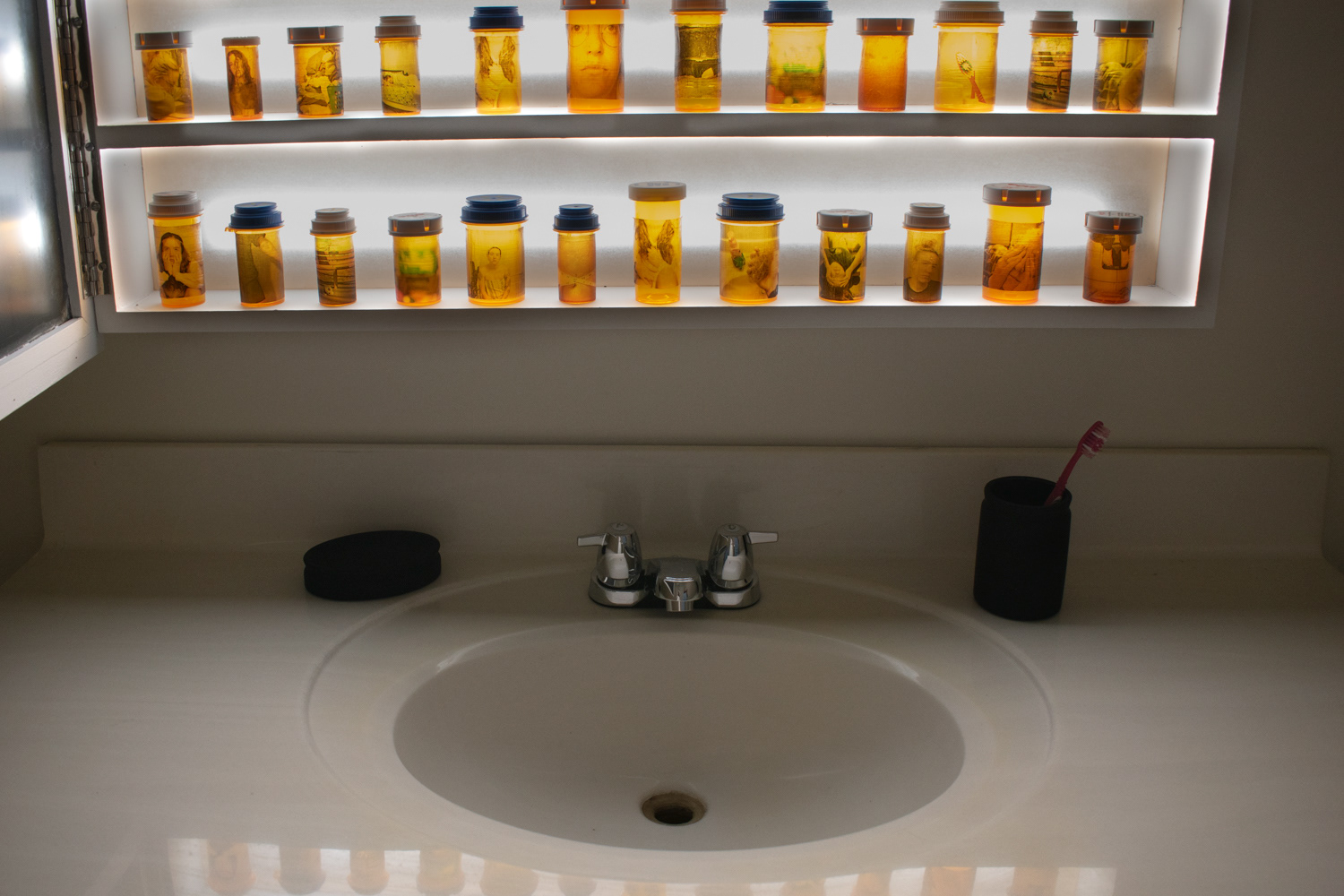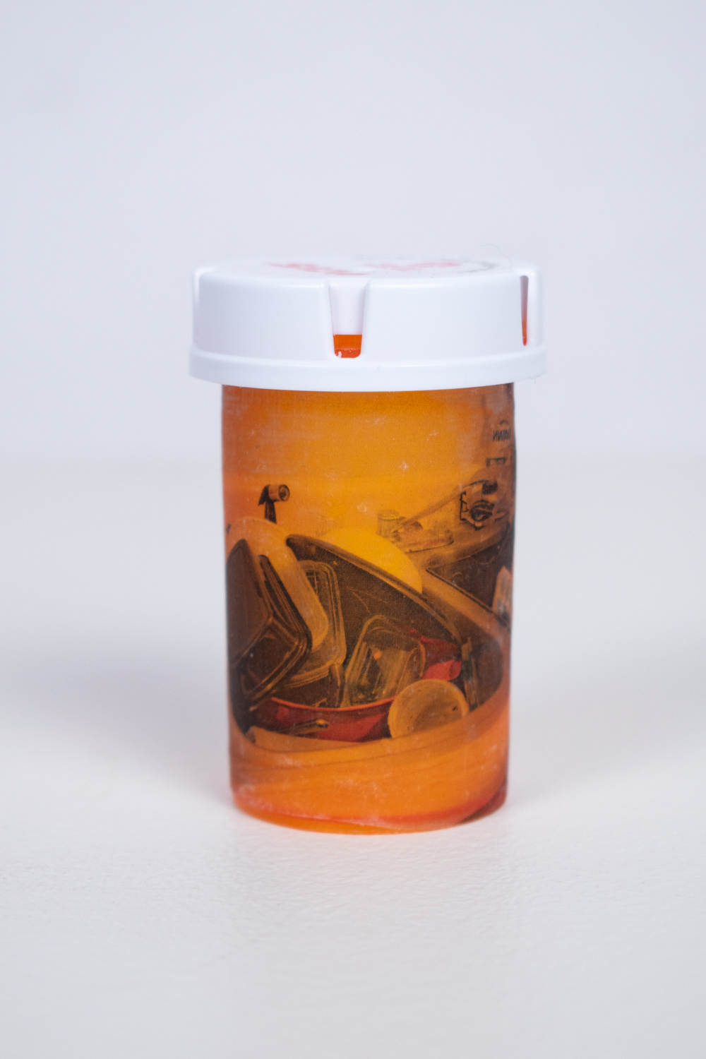 As a way to explore and question my own experience with bipolar disorder and depression, I created a medicine cabinet with sixty pill bottles. The oversized medicine cabinet represents the overwhelming effect that mental health can have on people’s lives. This number of bottles represents the number of months that I have been on medication. On the surface of the pill bottles, I illustrate different side effects of the medication, what symptoms individuals experienced before going on medication, and my own personal experience with taking psychotropic medications.